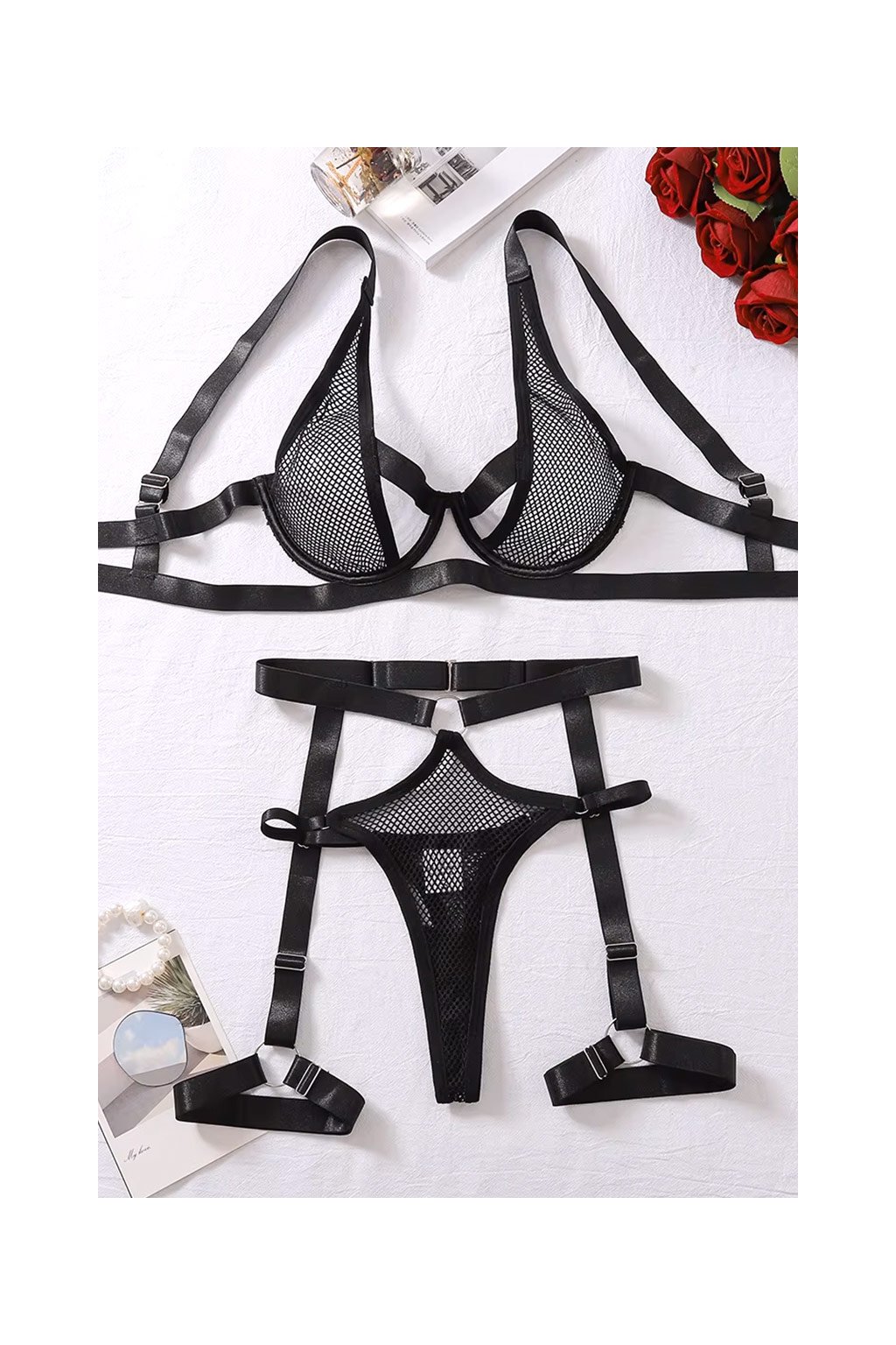 Sexy set sieťovaného spodného prádla v sýtej čiernej farbe...